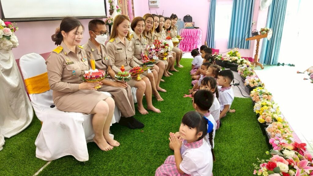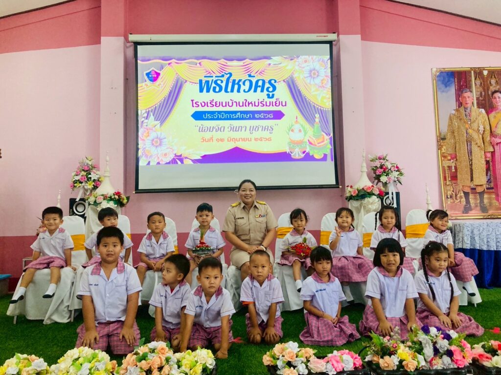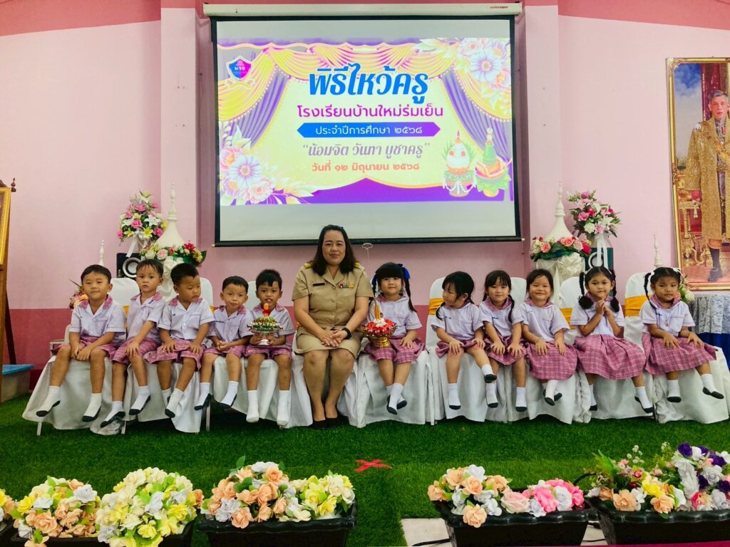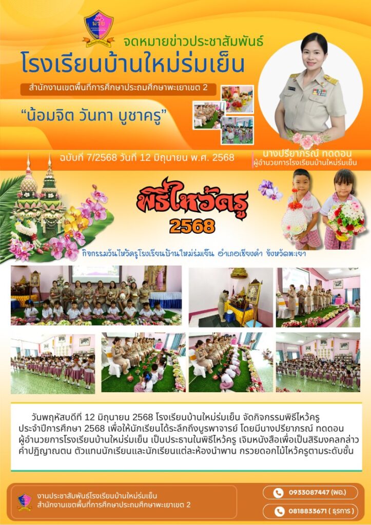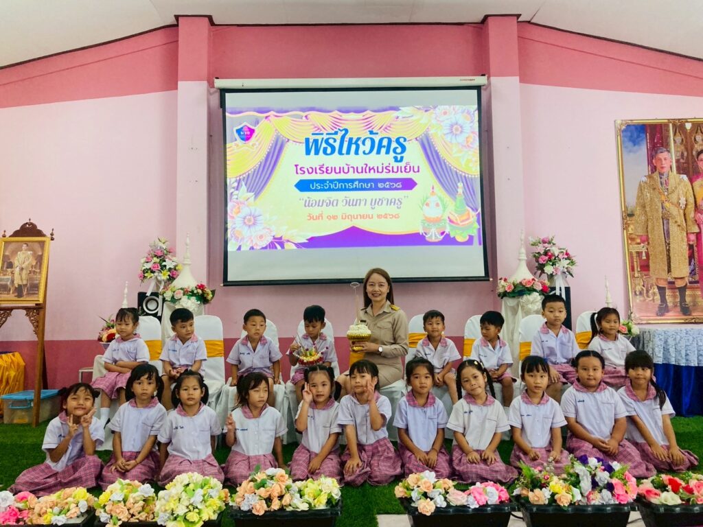 วันพฤหัสบดีที่ 12 มิถุนายน 2568 โรงเรียนบ้านใหม่ร่มเย็น จัดกิจกรรมพิธีไหว้ครู ประจำปีการศึกษา 2568 เพื่อให้นักเรียนได้ระลึกถึงบูรพาจารย์ โดยมีนางปรียาภรณ์ ทดดอน ผู้อำนวยการโรงเรียนบ้านใหม่ร่มเย็น เป็นประธานในพิธีไหว้ครู เจิมหนังสือเพื่อเป็นสิริมงคลกล่าวคำปฏิญาณตน ตัวแทนนักเรียนและนักเรียนแต่ละห้องนำพาน กรวยดอกไม้ไหว้ครูตามระดับชั้น