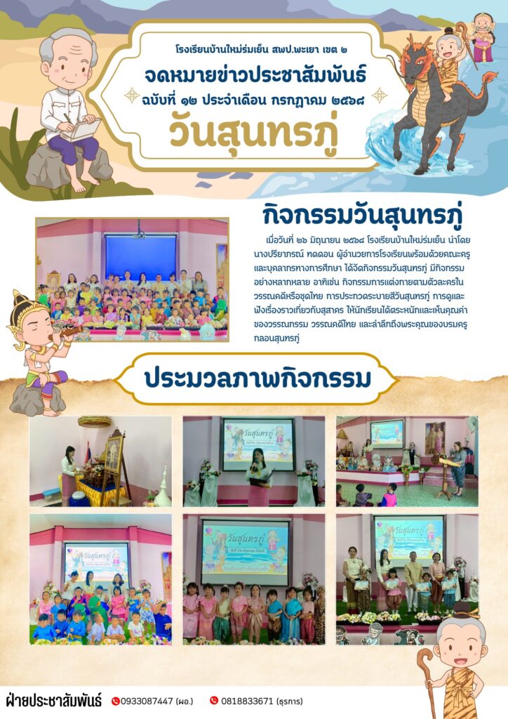 เมื่อวันที่ ๒๖ มิถุนายน ๒๕๖๘ โรงเรียนบ้านใหม่ร่มเย็น นำโดยนางปรียาภรณ์ ทดดอน ผู้อำนวยการโรงเรียนพร้อมด้วยคณะครูและบุคลากรทางการศึกษา ได้จัดกิจกรรมวันสุนทรภู่ มีกิจกรรมอย่างหลากหลาย อาทิเช่น กิจกรรมการแต่งกายตามตัวละครในวรรณคดีหรือชุดไทย การประกวดระบายสีวันสุนทรภู่ การดูและฟังเรื่องราวเกี่ยวกับสุสาคร ให้นักเรียนได้ตระหนักเเละเห็นคุณค่าของวรรณกรรม วรรณคดีไทย และลำลึกถึงพระคุณของบรมครูกลอนสุนทรภู่