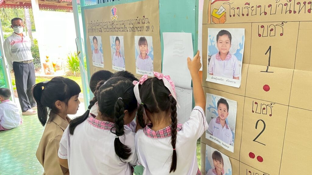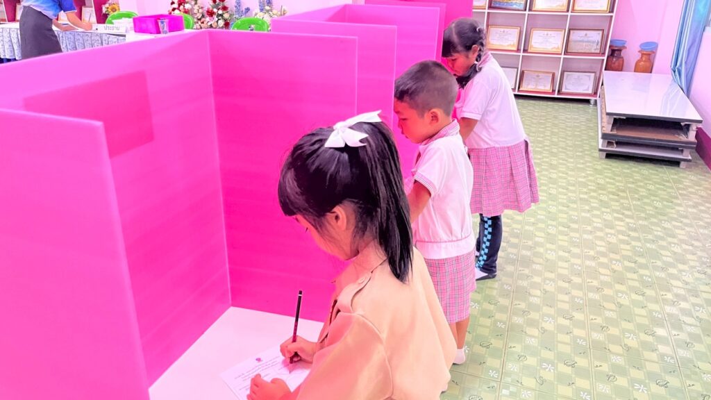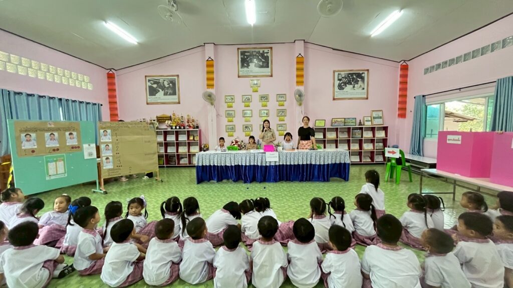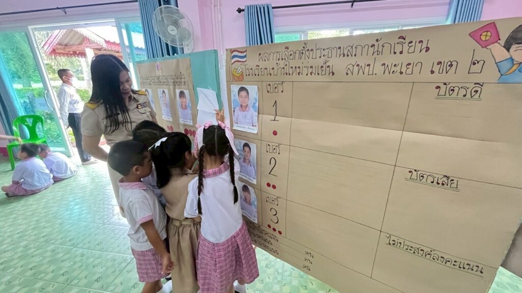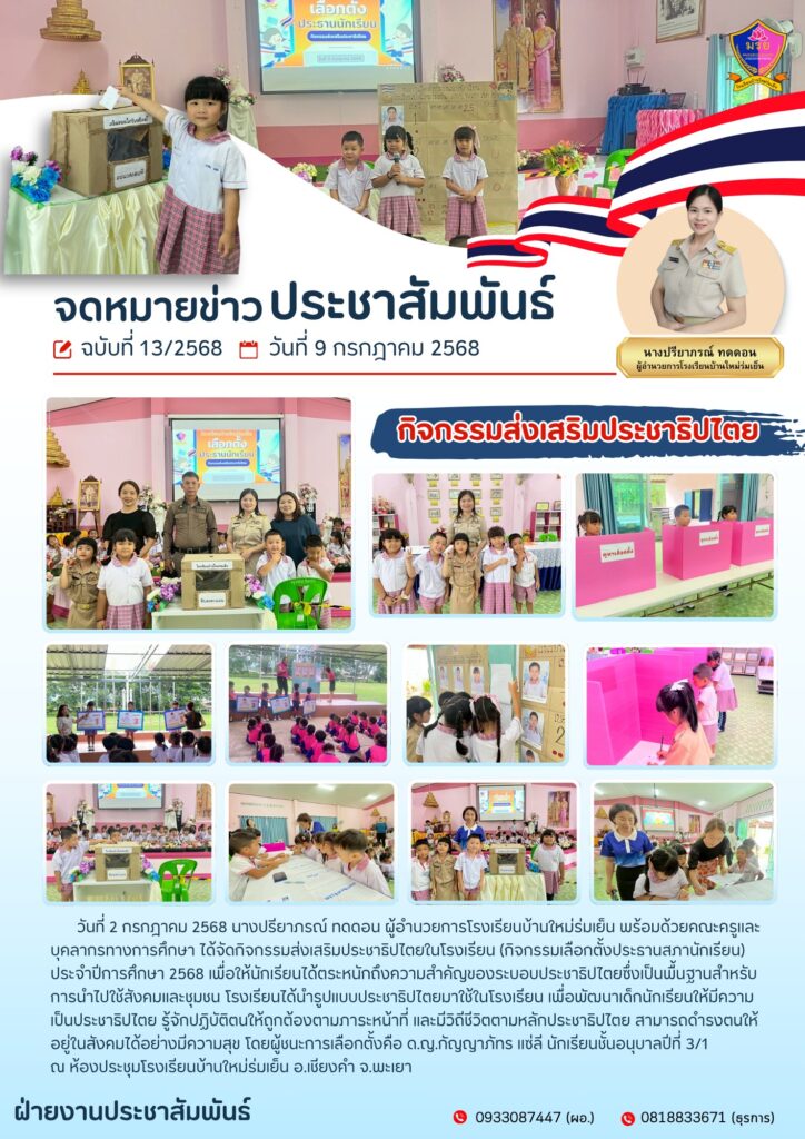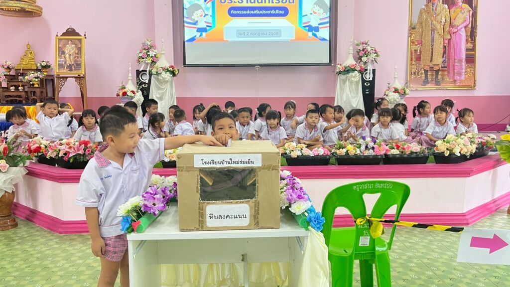 วันที่ 2 กรกฎาคม 2568 นางปรียาภรณ์ ทดดอน ผู้อำนวยการโรงเรียนบ้านใหม่ร่มเย็น พร้อมด้วยคณะครูและบุคลากรทางการศึกษา ได้จัดกิจกรรมส่งเสริมประชาธิปไตยในโรงเรียน (กิจกรรมเลือกตั้งประธานสภานักเรียน) ประจำปีการศึกษา 2568 เพื่อให้นักเรียนได้ตระหนักถึงความสำคัญของระบอบประชาธิปไตยซึ่งเป็นพื้นฐานสำหรับการนำไปใช้สังคมและชุมชน โรงเรียนได้นำรูปแบบประชาธิปไตยมาใช้ในโรงเรียน เพื่อพัฒนาเด็กนักเรียนให้มีความเป็นประชาธิปไตย รู้จักปฏิบัติตนให้ถูกต้องตามภาระหน้าที่ และมีวิถีชีวิตตามหลักประชาธิปไตย สามารถดำรงตนให้อยู่ในสังคมได้อย่างมีความสุข โดยผู้ชนะการเลือกตั้งคือ ด.ญ.กัญญาภัทร แซ่ลี นักเรียนชั้นอนุบาลปีที่ 3/1 ณ ห้องประชุมโรงเรียนบ้านใหม่ร่มเย็น อ.เชียงคำ จ.พะเยา