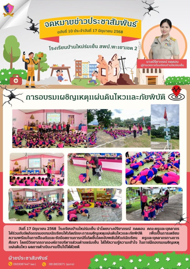 วันที่ 17 มิถุนายน 2568 โรงเรียนบ้านใหม่ร่มเย็น นำโดยนางปรียาภรณ์ ทดดอน คณะครูและบุคลากรทางการศึกษา ได้ร่วมกันจัดวันที่ 17 มิถุนายน 2568 โรงเรียนบ้านใหม่ร่มเย็น นำโดยนางปรียาภรณ์ ทดดอน คณะครูและบุคลากรทางการศึกษา ได้ร่วมกันจัดกิจกรรมอบรมนักเรียนให้เกิดทักษะการเผชิญเหตุแผ่นดินไหวและภัยพิบัติ เพื่อเป็นการเตรียมความพร้อมในการป้องกันและรับมือสถานการณ์ที่เกิดขึ้นโดยฉับพลันให้แก่นักเรียน ครูและบุคลากรทางการศึกษา โดยมีวิทยากรจากองค์การบริหารส่วนตำบลร่มเย็น ได้ให้ความรู้ความเข้าใจ ในการฝึกอบรมเผชิญเหตุแผ่นดินไหว ผลการดำเนินงานเป็นไปได้ด้วยดี เพื่อเป็นการเตรียมความพร้อมในการป้องกันและรับมือสถานการณ์ที่เกิดขึ้นโดยฉับพลันให้แก่นักเรียน ครูและบุคลากรทางการศึกษา โดยมีวิทยากรจากองค์การบริหารส่วนตำบลร่มเย็น ได้ให้ความรู้ความเข้าใจ ในการฝึกอบรมเผชิญเหตุแผ่นดินไหว ผลการดำเนินงานเป็นไปได้ด้วยดี