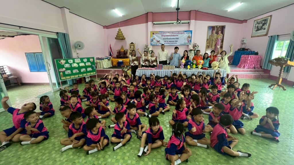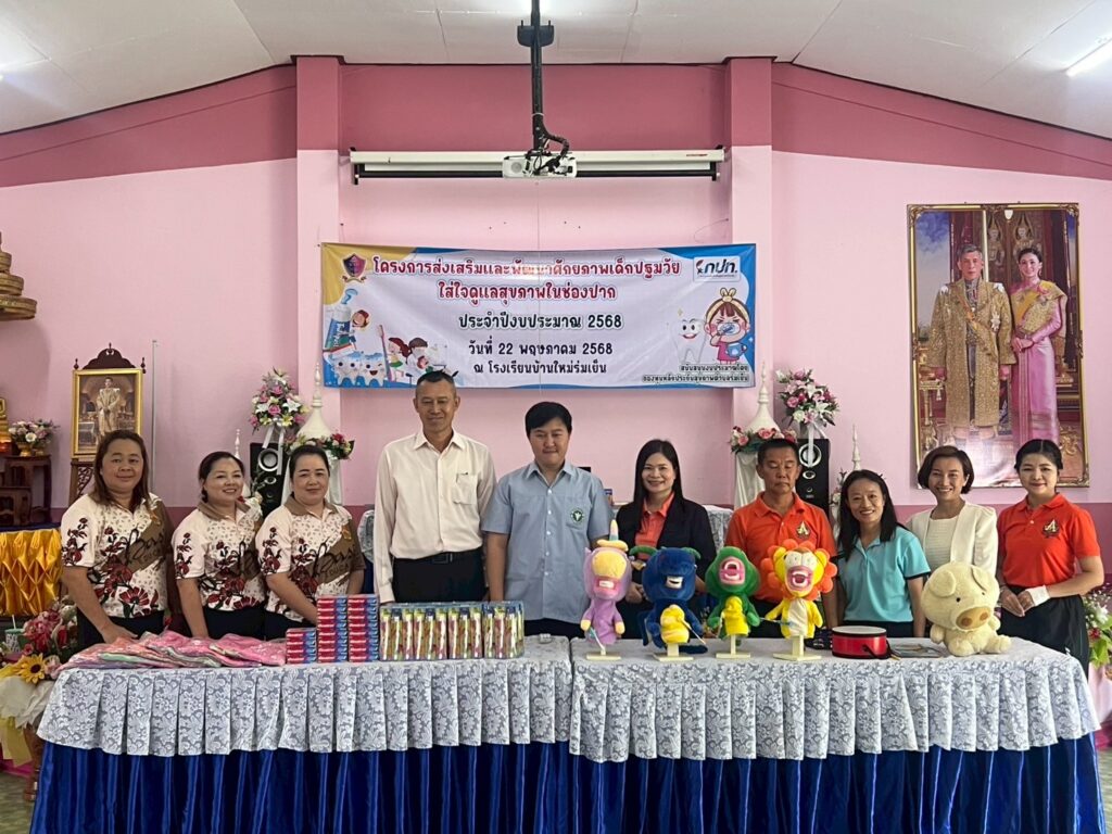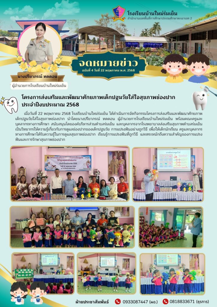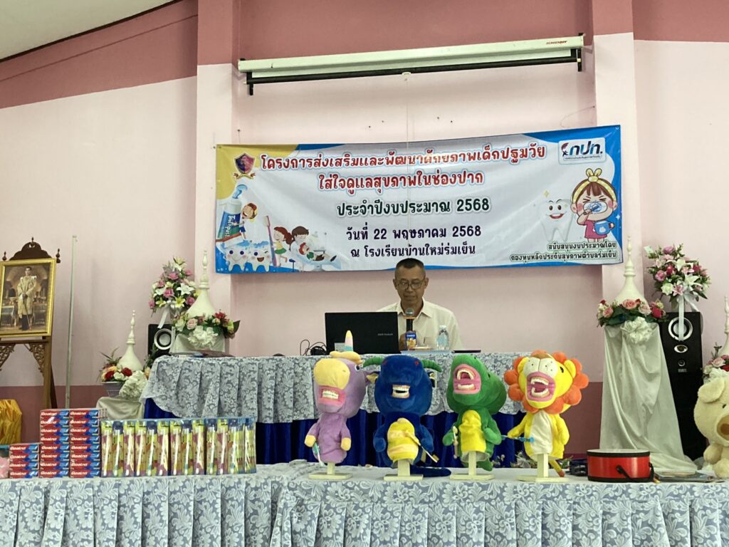 เมื่อวันที่ 22 พฤษภาคม 2568 โรงเรียนบ้านใหม่ร่มเย็น ได้ดำเนินการจัดกิจกรรมโครงการส่งเสริมและพัฒนาศักยภาพเด็กปฐมวัยใส่ใจสุขภาพช่องปาก นำโดยนางปรียาภรณ์ ทดดอน ผู้อำนวยการโรงเรียนบ้านใหม่ร่มเย็น พร้อมคณะครูและบุคลากรทางการศึกษา สนับสนุนโดยองค์บริหารส่วนตำบลร่มเย็น และนายณัฐสิทธิ์ รัตนกระจ่างศรี บุคลากรจากโรงพยาบาลส่งเสริมสุขภาพตำบลร่มเย็น เป็นวิทยากรให้ความรู้เกี่ยวกับการดูแลช่องปากของเด็กปฐมวัย การแปรงฟันอย่างถูกวิธี เพื่อให้เด็กนักเรียน ครูและบุคลากรทางการศึกษาได้รับความรู้ในการดูแลสุขภาพช่องปาก เรียนรู้การแปรงฟันที่ถูกวิธี และตระหนักถึงความสำคัญของการแปรงฟันและการรักษาสุขภาพช่องปาก