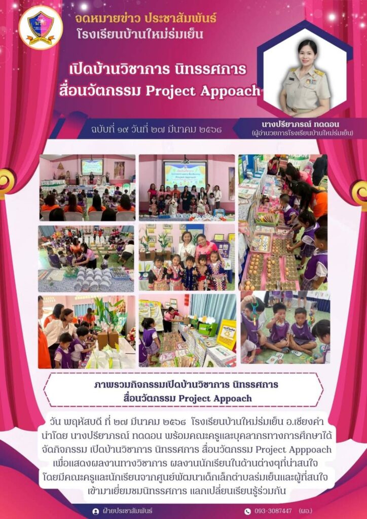 วัน พฤหัสบดี ที่ 27 มีนาคม 2568 โรงเรียนบ้านใหม่ร่มเย็น อ.เชียงคำ นำโดย นางปรียาภรณ์ ทดดอน พร้อมคณะครูและบุคลากรทางการศึกษา ได้จัดกิจกรรม เปิดบ้านวิชาการ นิทรรศการ สื่อนวัตกรรม Project Apppoach เพื่อแสดงผลงานทางวิชาการ สื่อนวัตกรรม ผลงานนักเรียนในด้านต่างๆที่น่าสนใจ โดยมีคณะครูและนักเรียนจากศูนย์พัฒนาเด็กเล็กตำบลร่มเย็นและผู้ที่สนใจ เข้ามาเยี่ยมชมนิทรรศการ แลกเปลี่ยนเรียนรู้ร่วมกัน