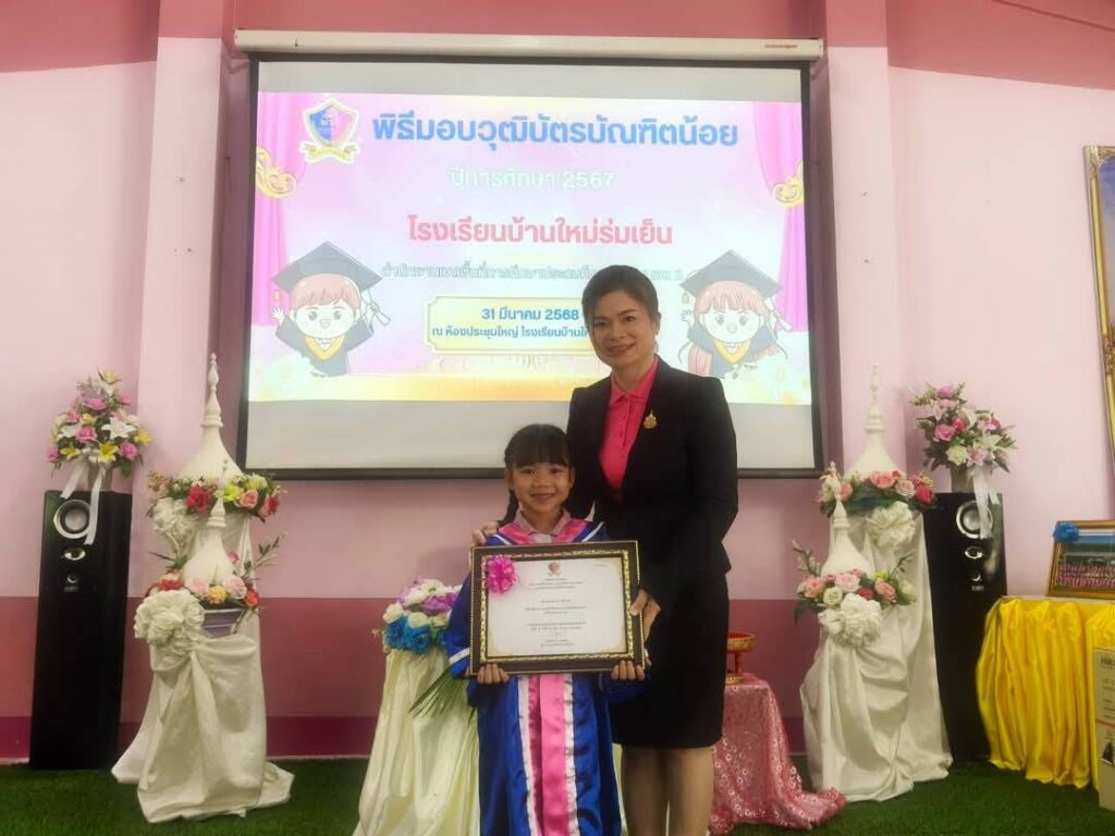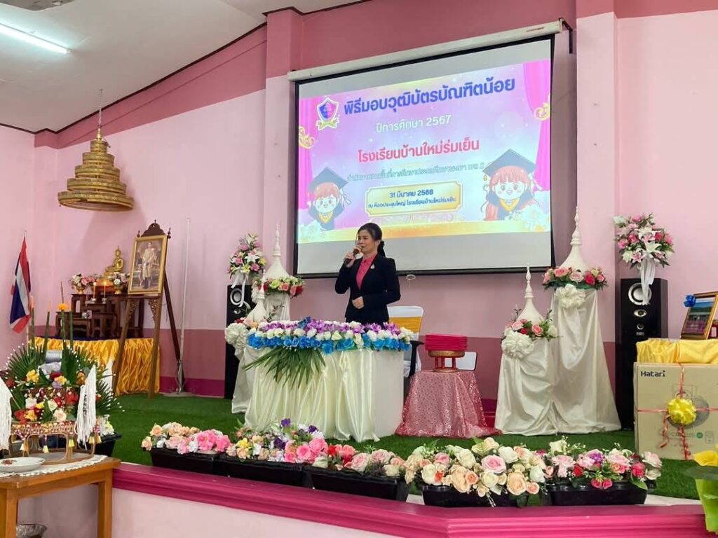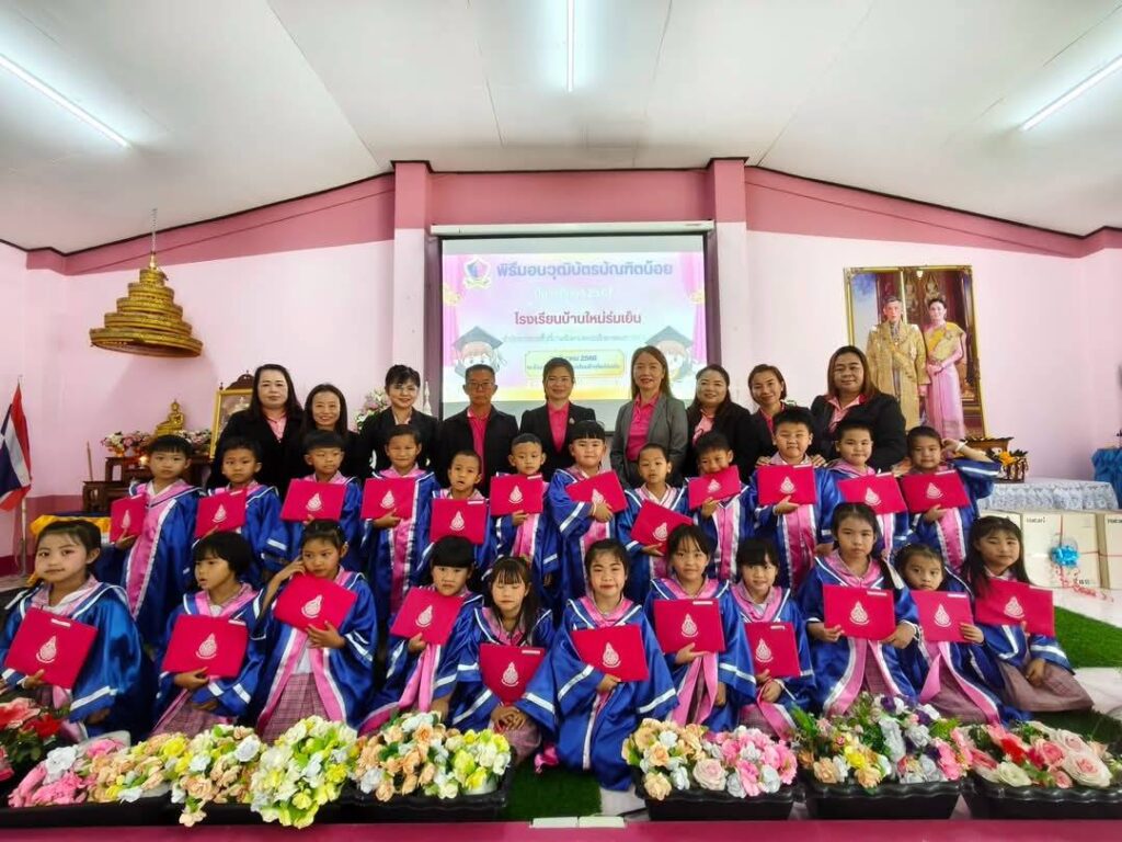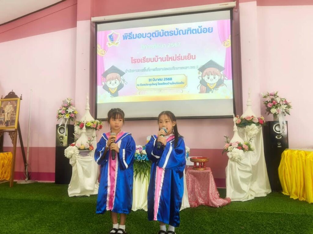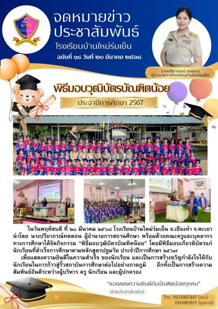 ในวันพฤหัสบดี ที่ 20 มีนาคม 2567โรงเรียนบ้านใหม่ร่มเย็น อ.เชียงคำ จ.พะเยา นำโดย นางปรียาภรณ์ ทดดอน ผู้อำนวยการสถานศึกษา พร้อมด้วยคณะครูและบุคลากรทางการศึกษาได้จัดกิจกรรม “พิธีมอบวุฒิบัตรบัณฑิตน้อย” โดยมีพิธีมอบเกียรติบัตรแก่นักเรียนที่สำเร็จการศึกษาตามหลักสูตรปฐมวัย และนักเรียนดีเด่น ประจำปีการศึกษา ๒๕๖๗