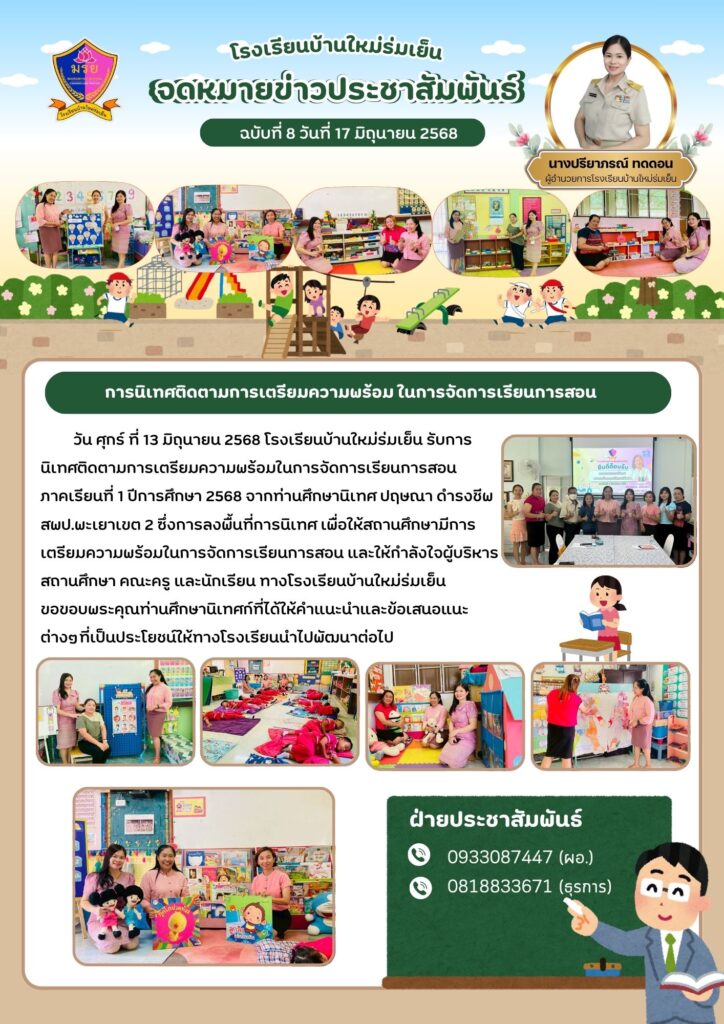 วัน ศุกร์ ที่ 13 มิถุนายน 2568 โรงเรียนบ้านใหม่ร่มเย็น รับการนิเทศติดตามการเตรียมความพร้อมในการจัดการเรียนการสอนภาคเรียนที่ 1 ปีการศึกษา 2568 จากท่านศึกษานิเทศ ปฤษณา ดำรงชีพ สพป.พะเยาเขต 2 ซึ่งการลงพื้นที่การนิเทศ เพื่อให้สถานศึกษามีการเตรียมความพร้อมในการจัดการเรียนการสอน และให้กำลังใจผู้บริหารสถานศึกษา คณะครู และนักเรียน ทางโรงเรียนบ้านใหม่ร่มเย็น ขอขอบพระคุณท่านศึกษานิเทศก์ที่ได้ให้คำแนะนำและข้อเสนอแนะ ต่างๆที่เป็นประโยชน์ให้ทางโรงเรียนนำไปพัฒนาต่อไป