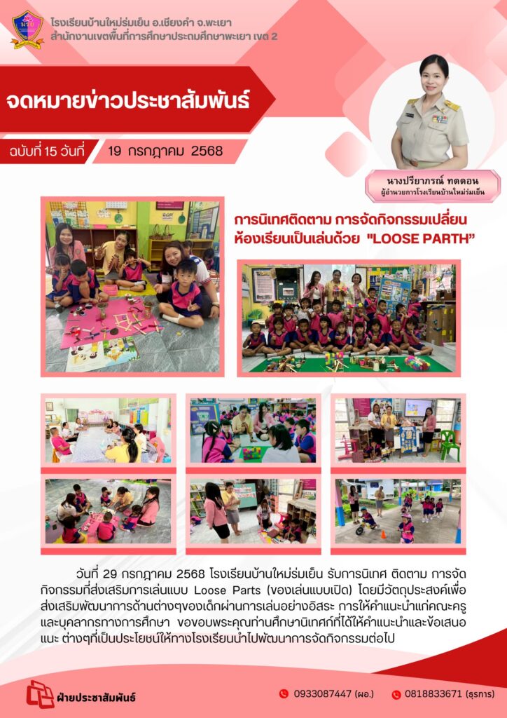 วันที่ 29 กรกฎาคม 2568 โรงเรียนบ้านใหม่ร่มเย็น รับการนิเทศ ติดตาม การจัดกิจกรรมที่ส่งเสริมการเล่นแบบ Loose Parts (ของเล่นแบบเปิด) โดยมีวัตถุประสงค์เพื่อส่งเสริมพัฒนาการด้านต่างๆของเด็กผ่านการเล่นอย่างอิสระ การให้คำแนะนำแก่คณะครูและบุคลากรทางการศึกษา ขอขอบพระคุณท่านศึกษานิเทศก์ที่ได้ให้คำแนะนำและข้อเสนอแนะ ต่างๆที่เป็นประโยชน์ให้ทางโรงเรียนนำไปพัฒนาการจัดกิจกรรมต่อไป