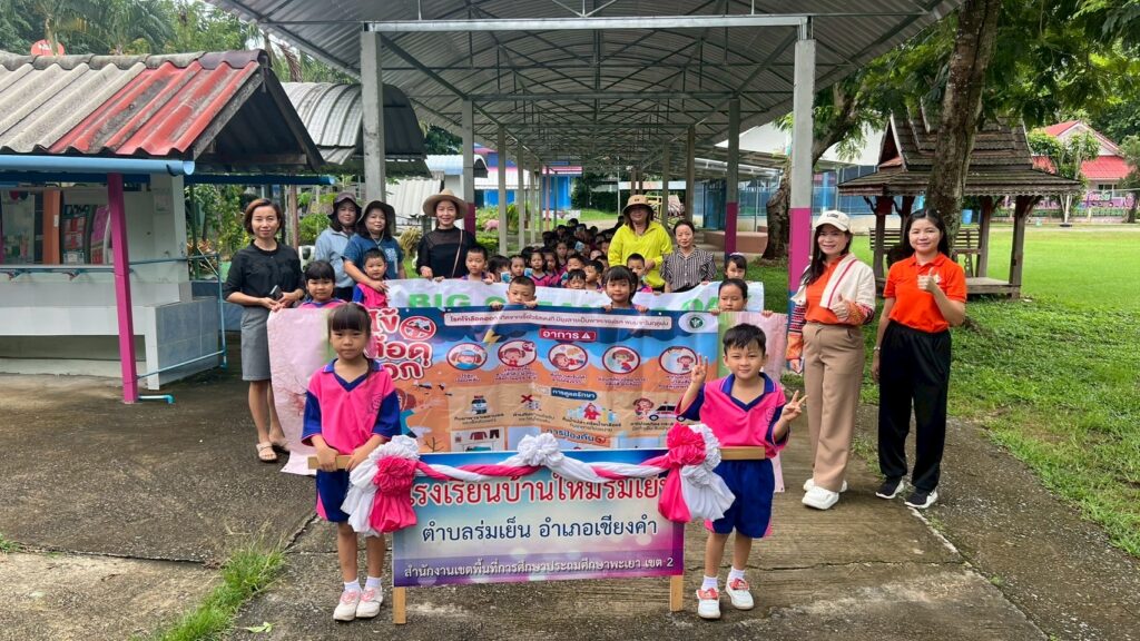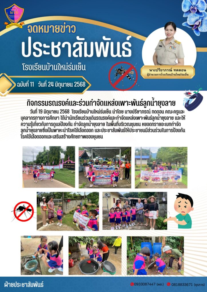 วันที่ 19 มิถุนายน 2568 โรงเรียนบ้านใหม่ร่มเย็น นำโดย นางปรียาภรณ์ ทดดอน คณะครูและบุคลากรทางการศึกษา ได้นำนักเรียนร่วมเดินรณรงค์และกำจัดแหล่งเพาะพันธ์ลูกน้ำยุงลาย และให้ความรู้เกี่ยวกับการดูแลป้องกัน กำจัดลูกน้ำยุงลาย ในพื้นที่บริเวณชุมชน หยอดทรายอะเบทกำจัดลูกน้ำยุงลายซึ่งเป็นพาหะนำโรคไข้เลือดออก และประชาสัมพันธ์ให้ประชาชนมีส่วนร่วมในการป้องกันโรคไข้เลือดออกและเสริมสร้างศักยภาพของชุมชน