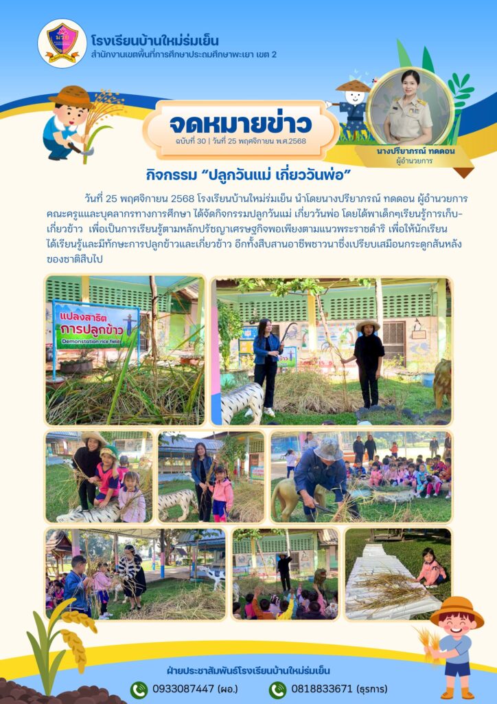 ข่าวกิจกรรมโรงเรียนบ้านใหม่ร่มเย็นได้จัดกิจกรรมปลูกวันแม่ เกี่ยววันพ่อ เด็กๆเรียนรู้การเก็บ-เกี่ยวข้าว เพื่อเป็นการเรียนรู้ตามหลักปรัชญาเศรษฐกิจพอเพียงตามแนวพระราชดำริ เพื่อให้นักเรียนได้เรียนรู้และมีทักษะการปลูกข้าวและเกี่ยวข้าว อีกทั้งสืบสานอาชีพชาวนาซึ่งเปรียบเสมือนกระดูกสันหลังของชาติสืบไป admin / 26/01/2026
